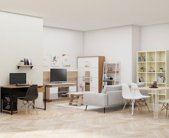 Household furniture with Engineered Wood raw materials such as Particle Board, MDF, and Plywood which are produced by PT. Olympic Starlight.